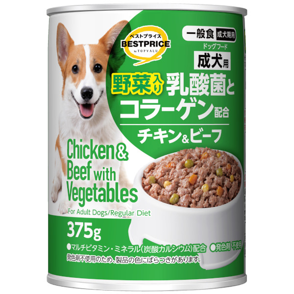 【ペット用】トップバリュベストプライス 乳酸菌とコラーゲン配合 ドッグフード チキン&ビーフ 野菜入 成犬用 375g