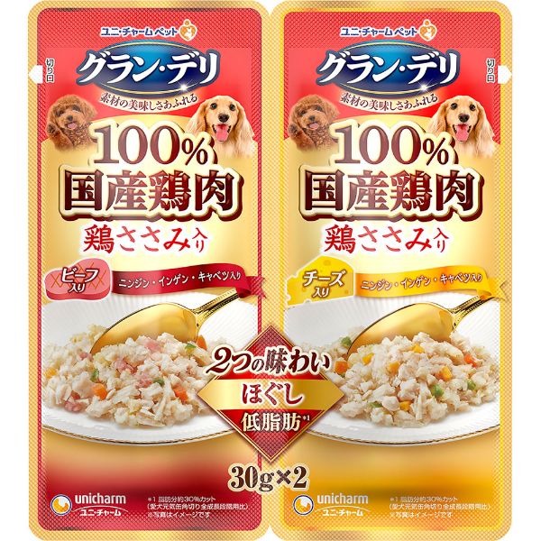 【ペット用】ユニ・チャーム グラン・デリ 100%国産鶏肉パウチ 2つの味わい 成犬用 ほぐし ビーフ&チーズ 30g×2個