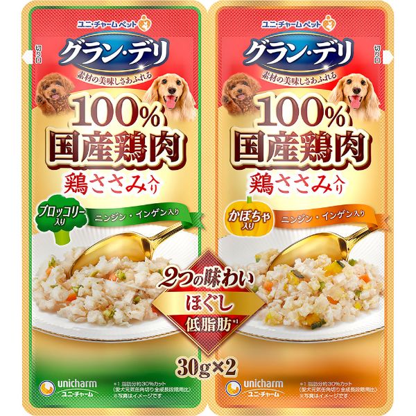 【ペット用】ユニ・チャーム グラン・デリ 100%国産鶏肉パウチ 2つの味わい 成犬用 ほぐし ブロッコリー&かぼちゃ 30g×2個