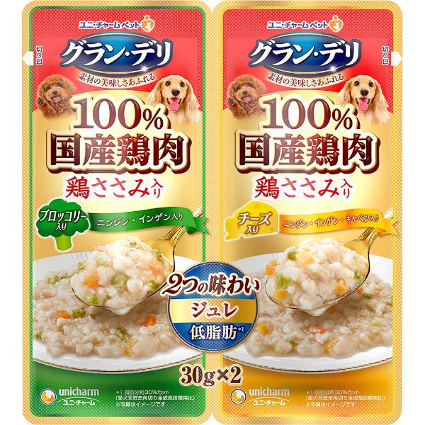 【ペット用】ユニ・チャーム グラン・デリ 100%国産鶏肉パウチ 2つの味わい 成犬用 ジュレ ブロッコリー&チーズ 30g×2個