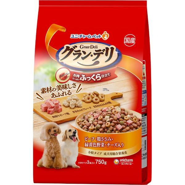 【ペット用】ユニ・チャーム グラン・デリ ふっくら仕立て ビーフ・白身魚・チキン・緑黄色野菜・チーズ・角切りビーフ粒入り 750g
