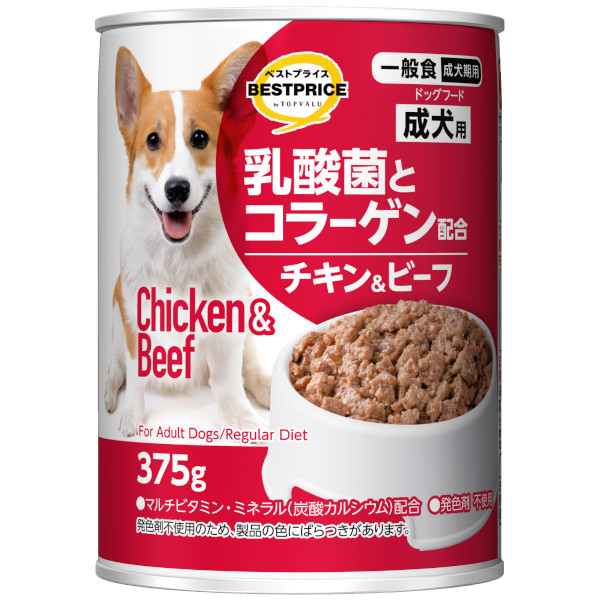 【ペット用】トップバリュベストプライス 乳酸菌とコラーゲン配合 ドッグフード チキン&ビーフ 成犬用 375g
