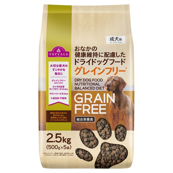 【ペット用】トップバリュ お腹の健康維持に配慮したドッグドライフード グレインフリー 成犬用 2.5kg(500g×5袋)