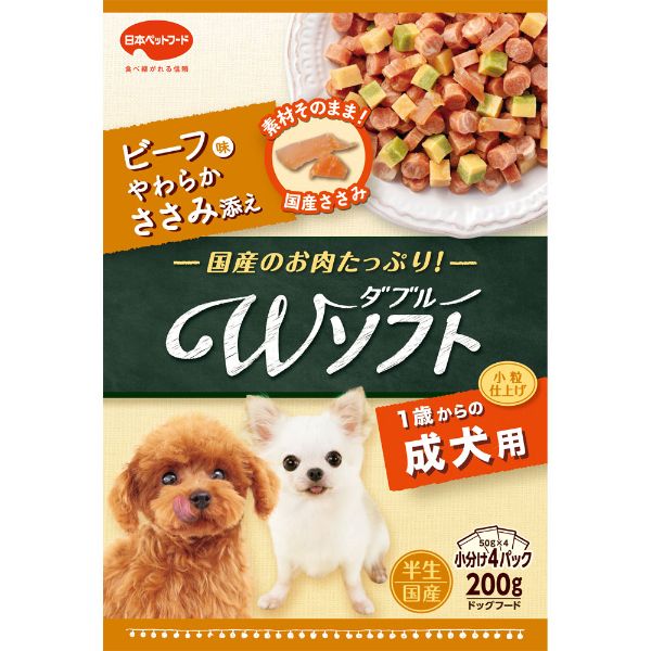 【ペット用】日本ペットフード ビタワン君のWソフト 成犬用 ビーフ味・やわらかささみ添え 200g(50g×4袋)