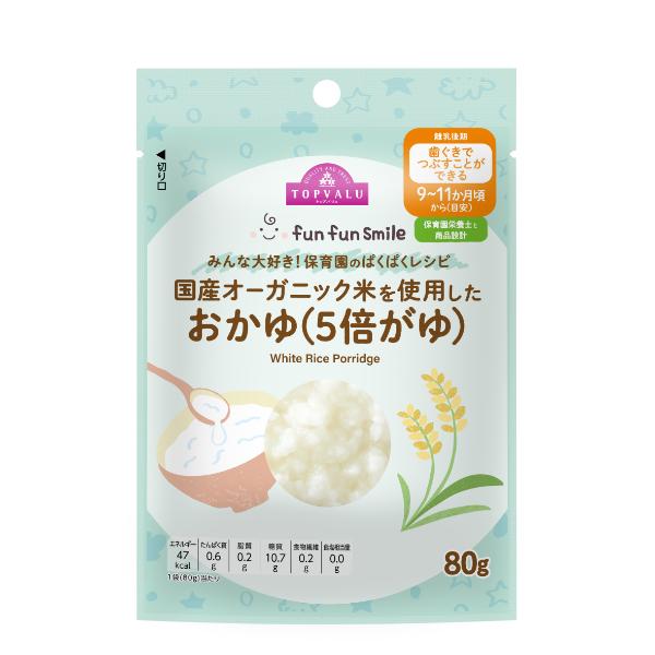 【9~11ヶ月頃から】トップバリュ fun fun smile 国産オーガニック米を使用した おかゆ 5倍がゆ 80g